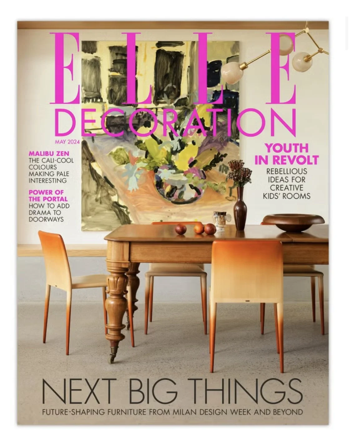 Elle Decoration UK No. 376 May 2024, featuring Laura Jones, Last One Standing 2024 and Andrew Hopkins, Flying Dream 2013. Art selection - Emily Harrison, Architecture - Studio Prineas, Styling - Clare Delmar, Photo - Anson Smart.